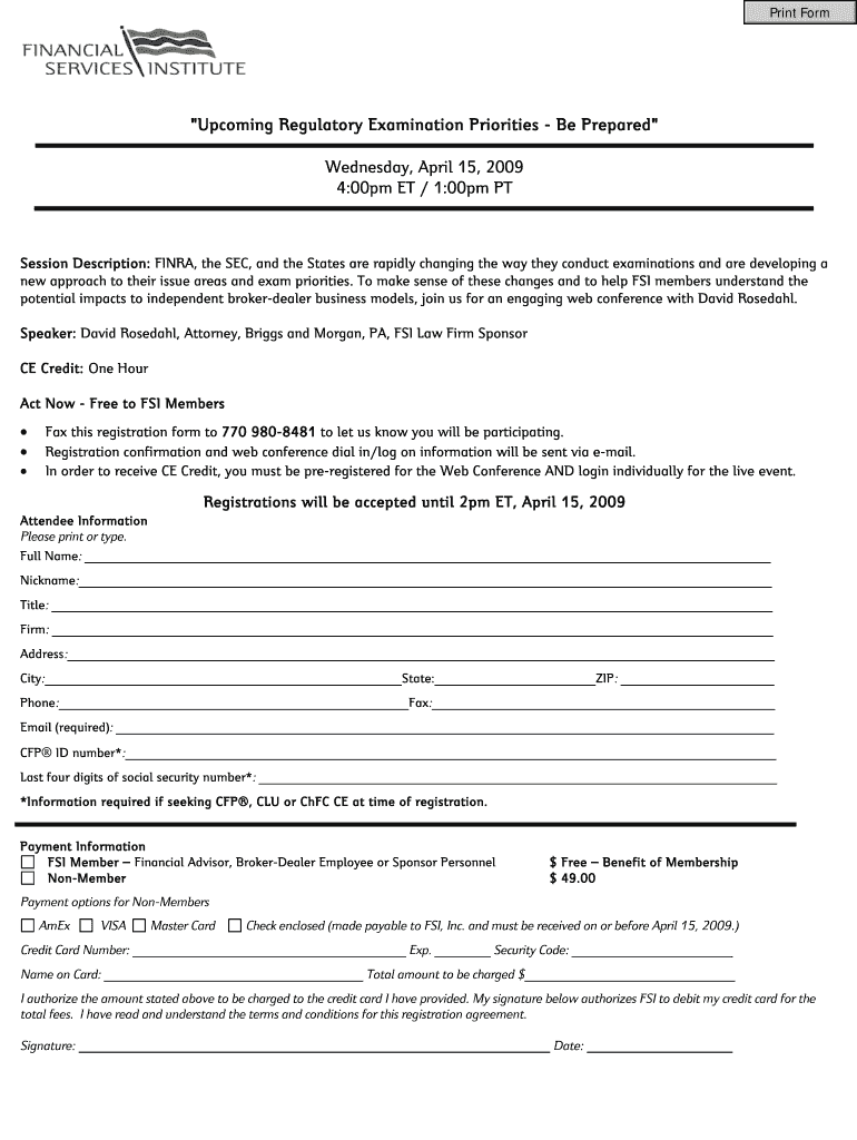 Print Form Upcoming Regulatory Examination Priorities Be Prepared Wednesday, April 15, 2009 4:00pm ET / 1:00pm PT Session Description: FINRA, the SEC, and the States are rapidly changing the way they