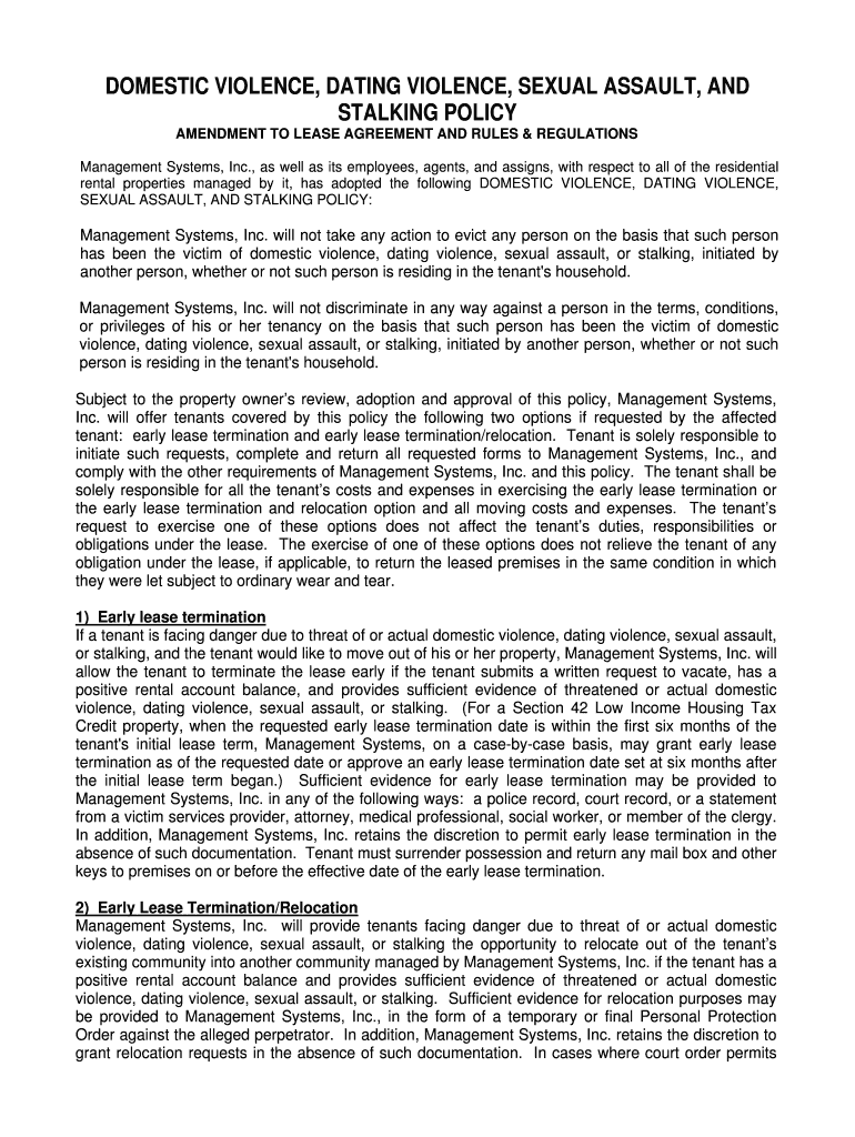 The Domestic Violence Lease Amendment is for tenants who are victims of domestic violence, dating violence, sexual assault, or stalking, seeking early lease termination.