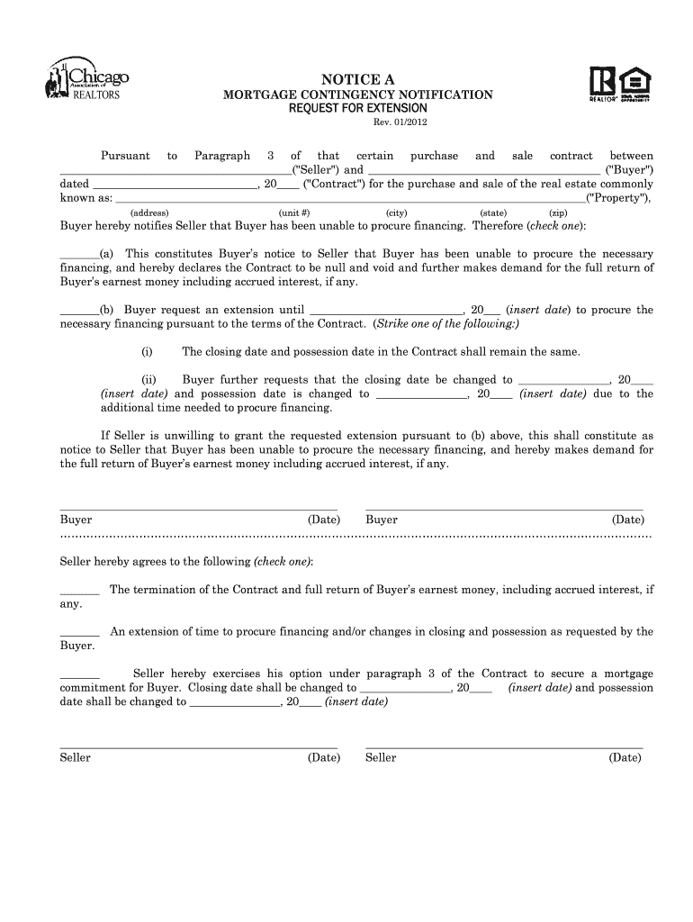 NOTICE A MORTGAGE CONTINGENCY NOTIFICATION REQUEST FOR EXTENSION Rev. 01/2012 Pursuant to Paragraph 3 of that certain purchase and sale contract between (“Seller “) and (“Buyer “) dated, 20