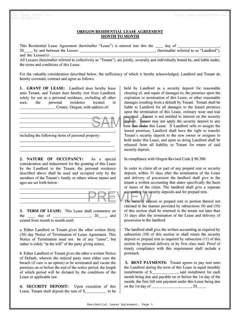 U.S. Legal Forms, Inc. Form OR8641LT http://www.uslegalforms.com OREGON RESIDENTIAL LEASE AGREEMENT MONTH TO MONTH This Residential Lease Agreement (hereinafter Lease) is entered into this the day