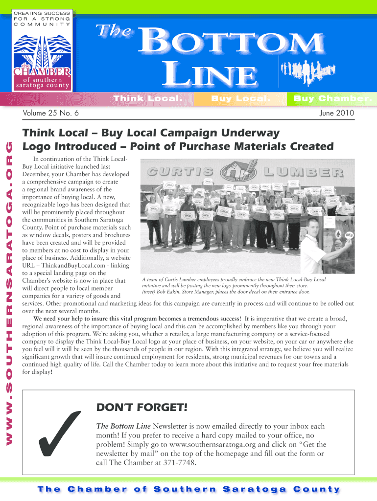 The BOTTOM LINE Think Local. W W W. S O U T H E R N S A R AT O G A. O R G Volume 25 No. 6 Buy Local. Buy Chamber. June 2010 Think Local Buy Local Campaign Underway Logo Introduced Point of Purchase