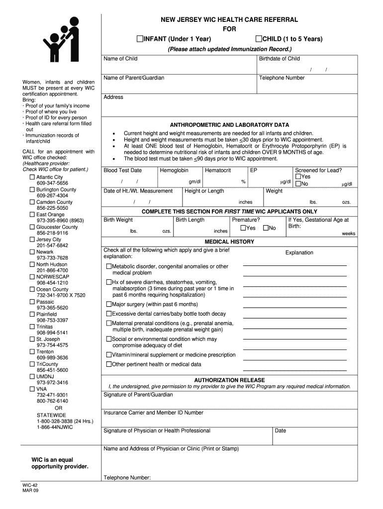 This document serves as a health care referral form for infants and children participating in the New Jersey WIC program. It requires specific health information, appointment details, and consent