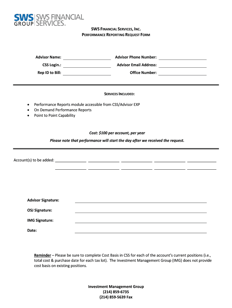 SAS FINANCIAL SERVICES, INC. PERFORMANCE REPORTING REQUEST FORM Advisor Name: Advisor Phone Number: CSS Login.: Advisor Email Address: Rep ID to Bill: Office Number: SERVICES INCLUDED: Performance