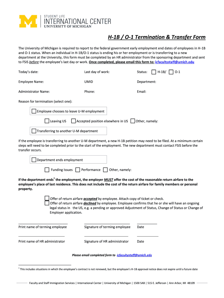 H1B / O1 Termination & Transfer Form The University of Michigan is required to report to the federal government early employment end dates of employees in H1B and O1 status. When an individual in