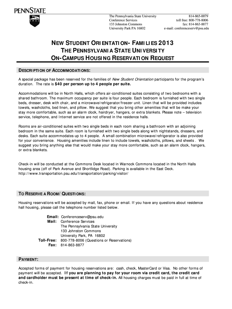 This document provides a reservation request form for families attending the New Student Orientation at The Pennsylvania State University, detailing accommodation information, reservation process,