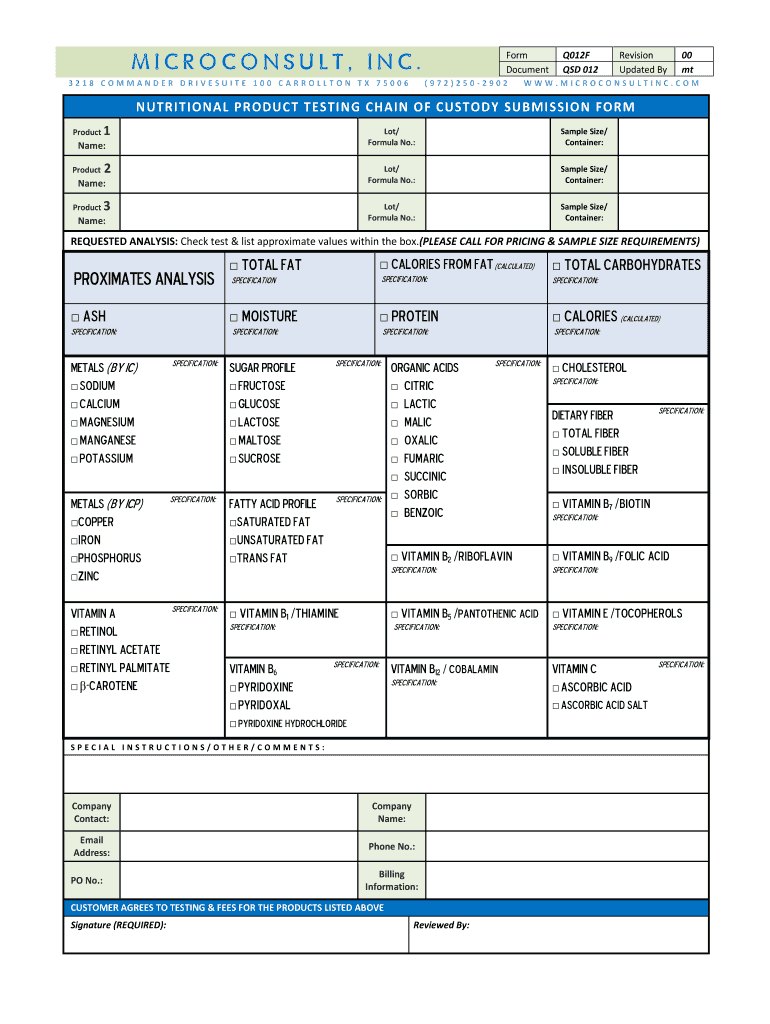Form Document Q012F SD 012 Revision Updated By 00 CT NUTRITIONAL PRODUCT TESTING CHAIN OF CUSTODY SUBMISSION FORM Product 1 Lot/ Formula No.: Sample Size/ Container: 2 Lot/ Formula No.: Sample Size/