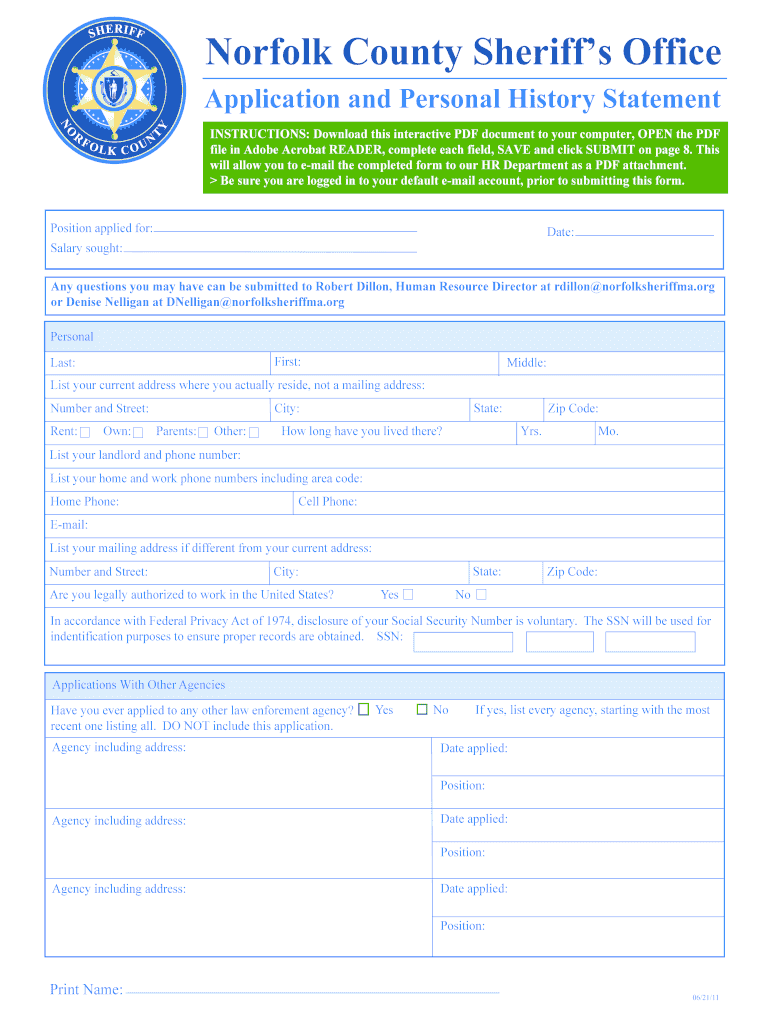 Norfolk County Sheriffs Office Application and Personal History Statement INSTRUCTIONS: Download this interactive PDF document to your computer, OPEN the PDF file in Adobe Acrobat Reader, complete