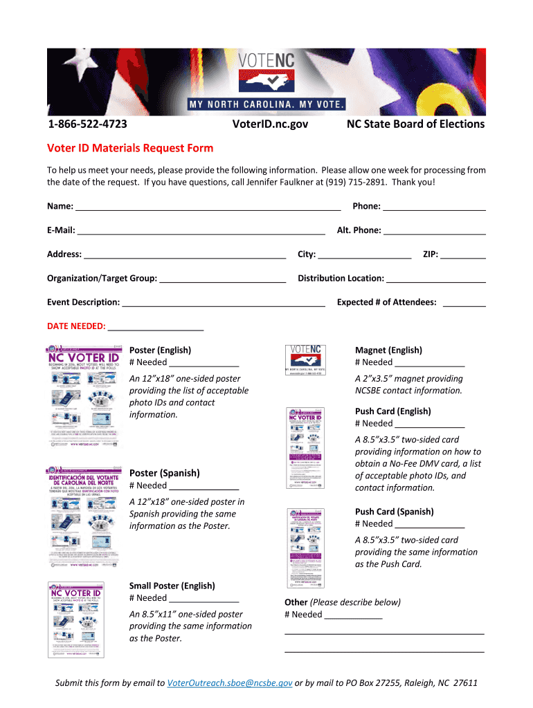 18665224723 Voter ID.NC.gov NC State Board of Elections Voter ID Materials Request Form To help us meet your needs, please provide the following information. Please allow one week for processing from