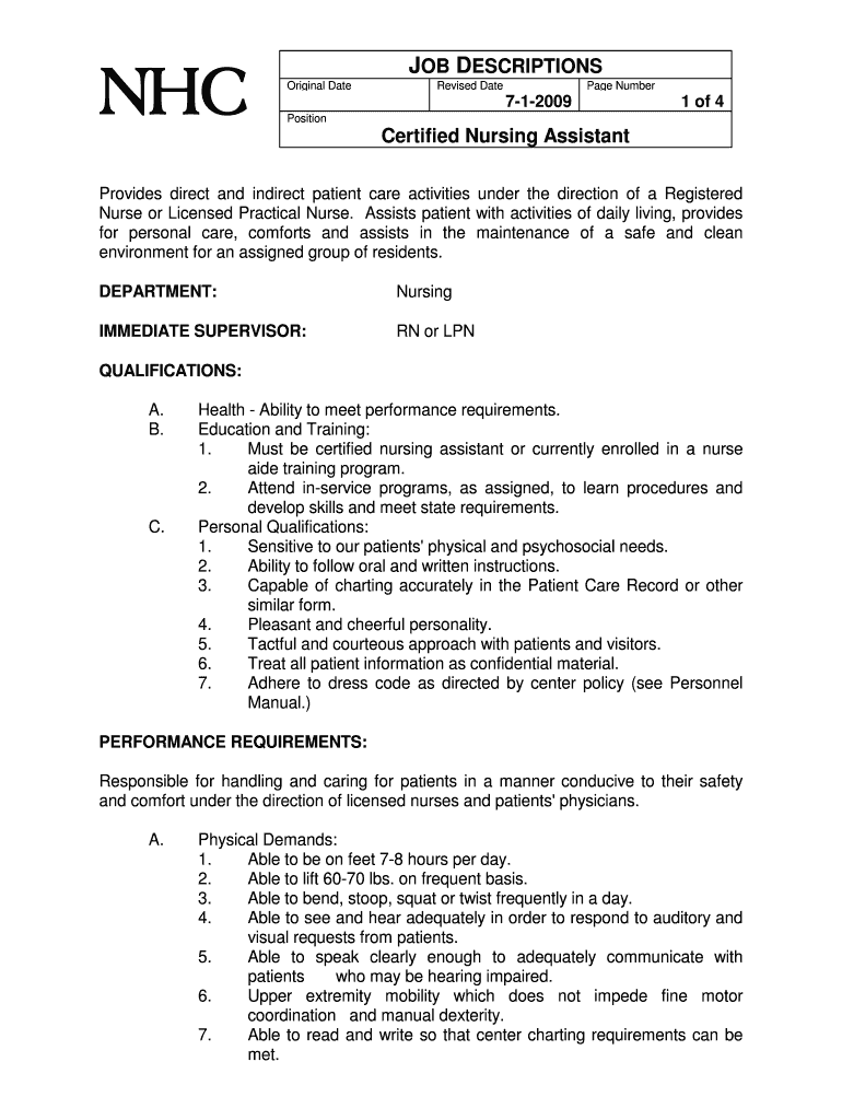 NHC JOB DESCRIPTIONS Original Date Revised Date Page Number 712009 1 of 4 Position Certified Nursing Assistants Provides direct and indirect patient care activities under the direction of a Registered