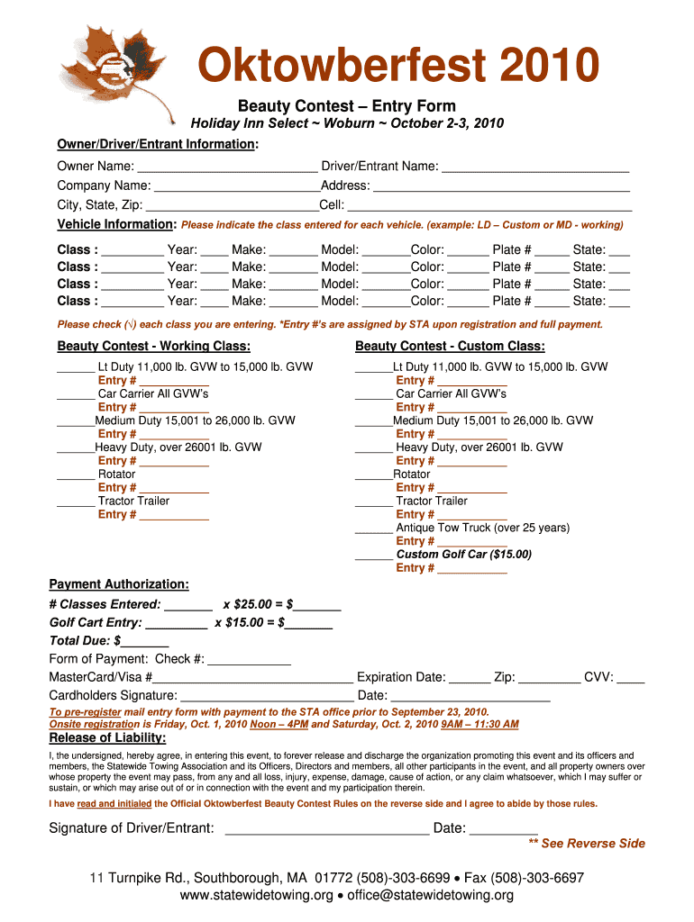 Oktoberfest 2010 Beauty Contest Entry Form Holiday Inn Select Woburn October 23, 2010, Owner/Driver/Entrant Information: Owner Name: Driver/Entrant Name: Company Name: Address: City, State, Zip: Cell: