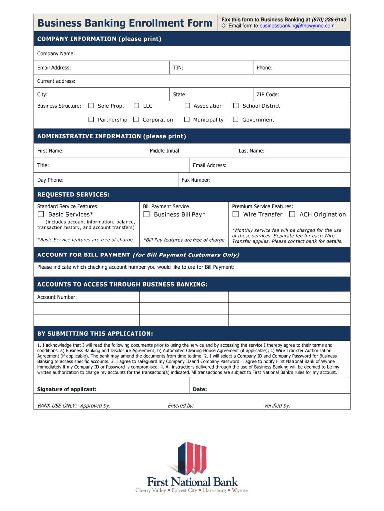 Business Banking Enrollment Form Fax this form to Business Banking at (870) 2386143 Or Email form to business banking fnbwynne.com COMPANY INFORMATION (please print) Company Name: Email Address: TIN:
