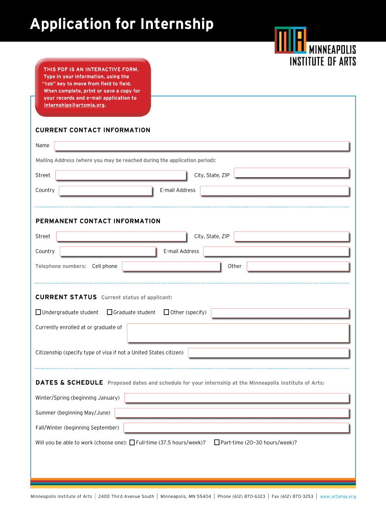 Application for Internship THIS PDF IS AN INTERACTIVE FORM. Type in your information, using the tab key to move from field to field. When complete, print or save a copy for your records and email