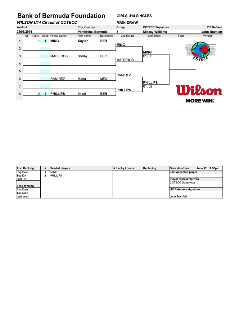 Bank of Bermuda Foundation GIRLS U14 SINGLES WILSON U14 Circuit of COT ECC MAIN DRAW Week of City, Country Group COT ECC Supervisor 23/06/2014 Pembroke, Bermuda 5 Mickey Williams St. Rank 1 1 Seed