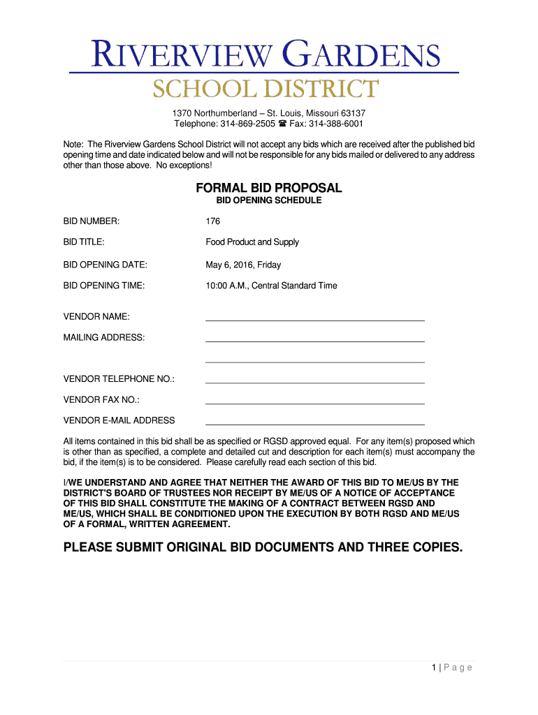 1370 Northumberland St. Louis, Missouri 63137 Telephone: 3148692505 Fax: 3143886001 Note: The Riverview Gardens School District will not accept any bids which are received after the published bid