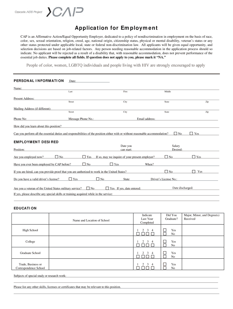 Application for Employment CAP is an Affirmative Action/Equal Opportunity Employer, dedicated to a policy of nondiscrimination in employment on the basis of race, color, sex, sexual orientation, religion,