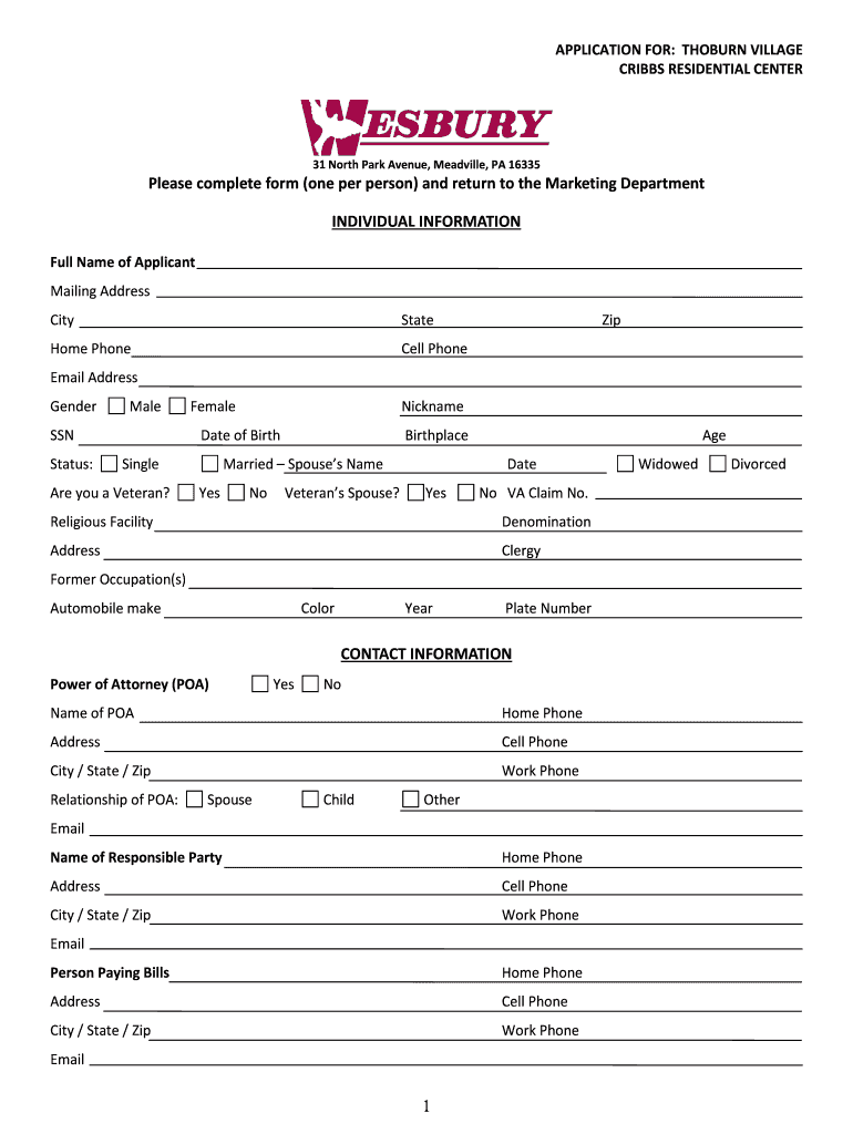 APPLICATION FOR: THORBURN VILLAGE CRIBS RESIDENTIAL CENTER 31 North Park Avenue, Melville, PA 16335 Please complete form (one per person) and return to the Marketing Department INDIVIDUAL INFORMATION