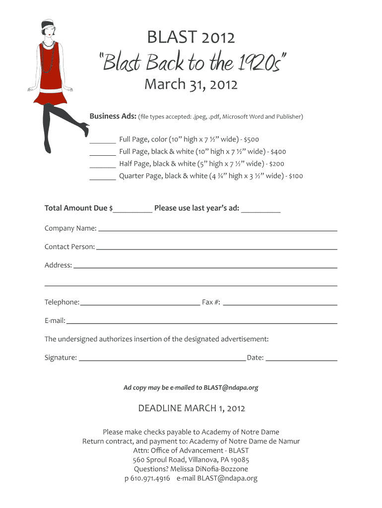 BLAST 2012 Blast Back to the 1920s March 31, 2012, Business Ads: (file types accepted: .jpeg, .pdf, Microsoft Word and Publisher) Full Page, color (10 high x 7 wide) $500 Full Page, black & white