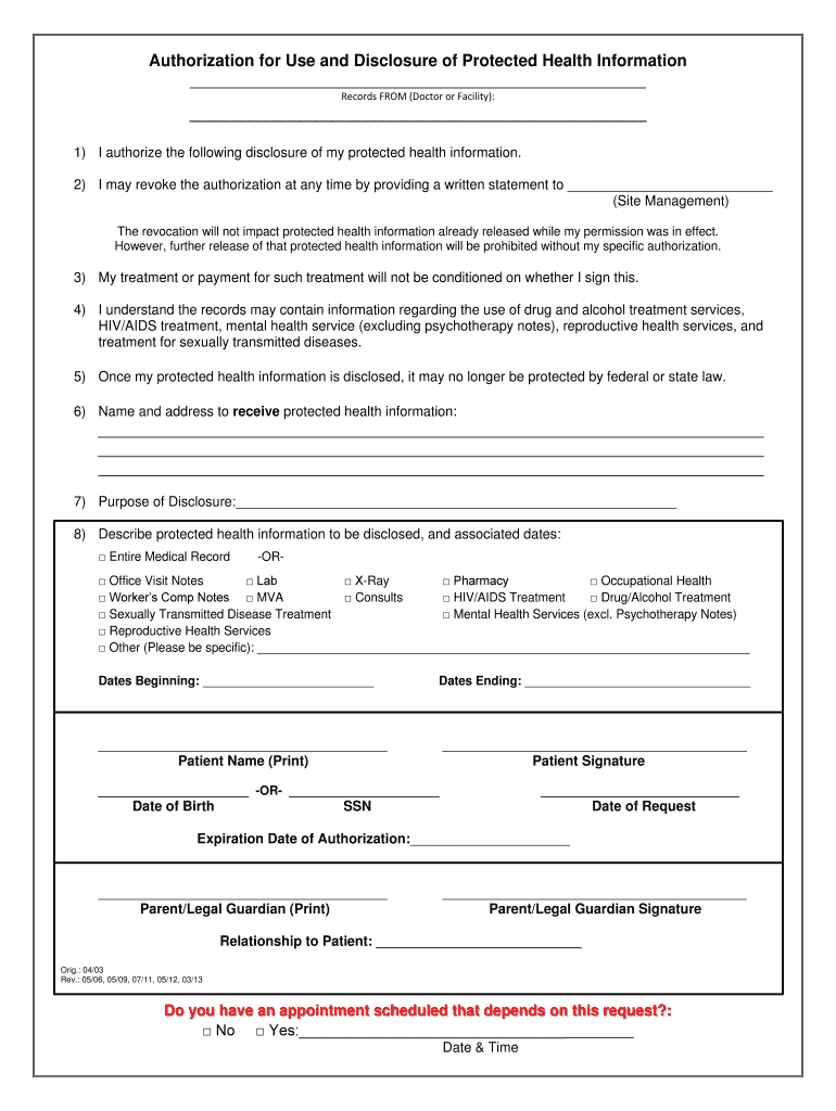Authorization for Use and Disclosure of Protected Health Information Records FROM (Doctor or Facility): 1) I authorize the following disclosure of my protected health information. 2) I may revoke