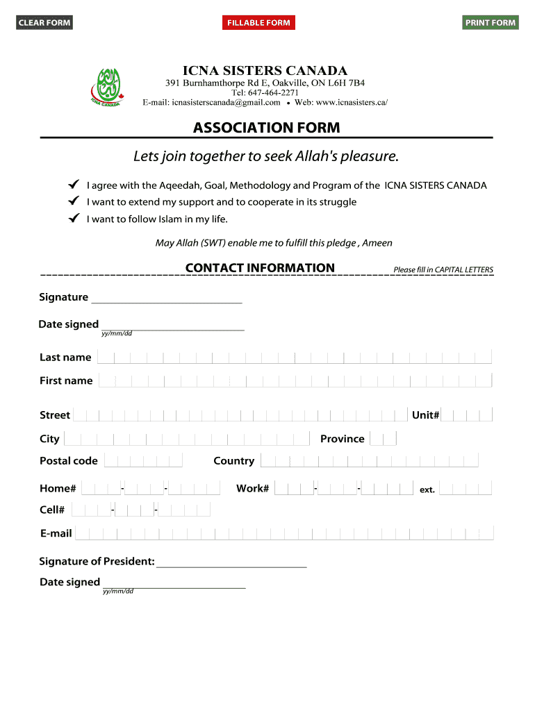 CLEAR FORM FILLABLE FORM PRINT FORM ICNA SISTERS CANADA 391 Burnhamthorpe Rd E, Oakville, ON L6H 7B4 Tel: 6474642271 Email: icnasisterscanada gmail.com Web: www.icnasisters.ca/ ASSOCIATION FORM Lets