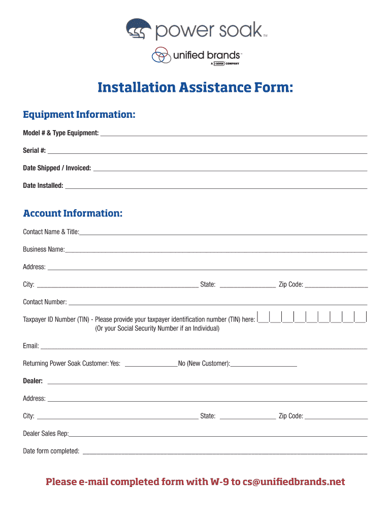 Installation Assistance Form: Equipment Information: Model # & Type Equipment: Serial #: Date Shipped / Invoiced: Date Installed: Account Information: Contact Name & Title: Business Name: Address: