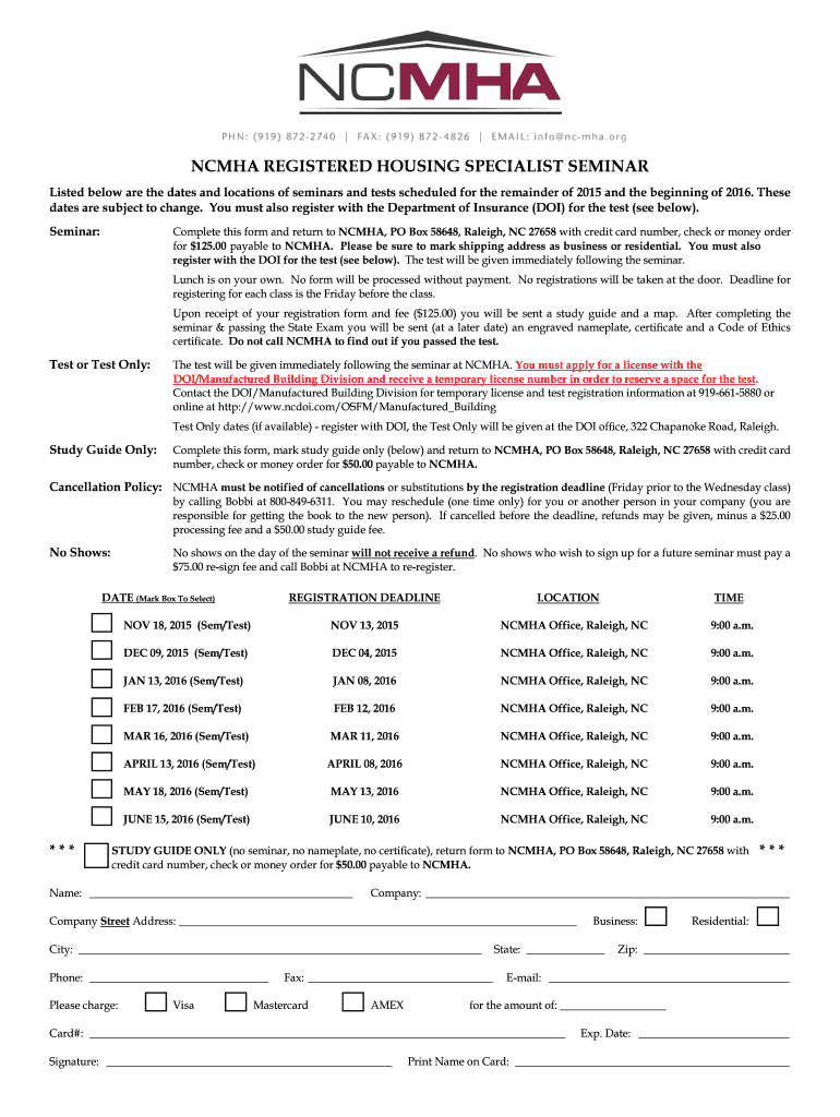 NCM HA REGISTERED HOUSING SPECIALIST SEMINAR Listed below are the dates and locations of seminars and tests scheduled for the remainder of 2015 and the beginning of 2016. These dates are subject to