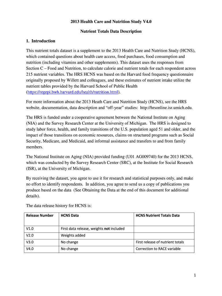 2013 Health Care and Nutrition Study V4.0 Nutrient Totals Data Description 1. Introduction This nutrient totals dataset is a supplement to the 2013 Health Care and Nutrition Study (HANS), which contained