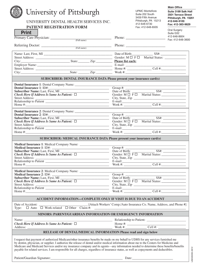 Main Office UNIVERSITY DENTAL HEALTH SERVICES INC. PATIENT REGISTRATION FORM UPMC Montessori Suite 202 South 3459 Fifth Avenue Pittsburgh, PA 15213 4126486730 Fax: 4126486505 Print Primary Care Physician: