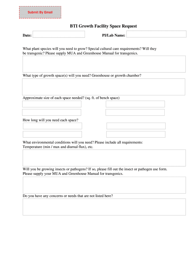 Submit By Email BTI Growth Facility Space Request Date: PI/Lab Name: What plant species will you need to grow? Special cultural care requirements? Will they be transgenic? Please supply MA and Greenhouse