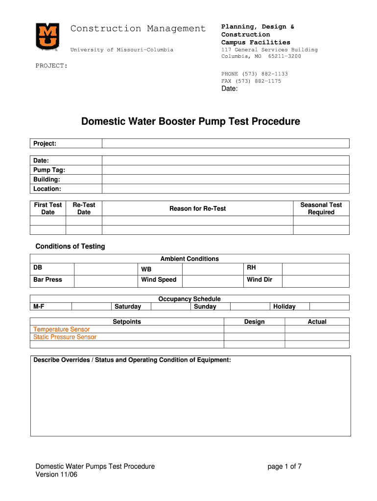 Construction Management Planning, Design & Construction Campus Facilities University of Missouri Columbia 117 General Services Building Columbia, MO 652113200 PROJECT: PHONE (573) 8821133 FAX (573)