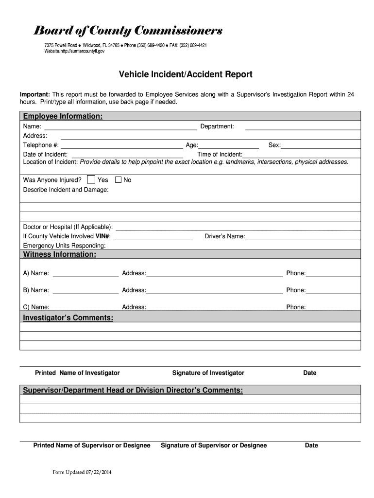Board of County Commissioners 7375 Powell Road Wildwood, FL 34785 Phone (352) 6894420 FAX: (352) 6894421 Website: http://sumtercountyfl.gov Vehicle Incident/Accident Report Important: This report