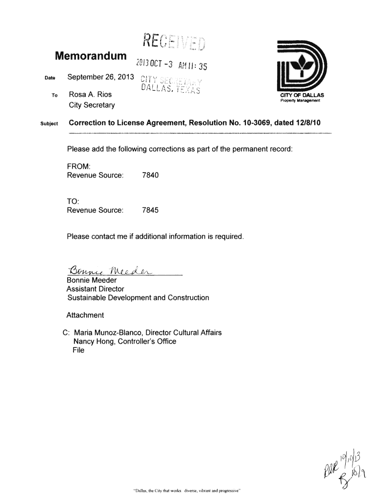 Memorandum Date 20130CT 3 AM /I: 3S September 26, 2013 ....... t I VU, O/ I:., / :: '. Vs 'i To Subject Rosa A. Rios City Secretary :, : I, ('. H, ) CITY OF DALLAS Property Comanagement Correction