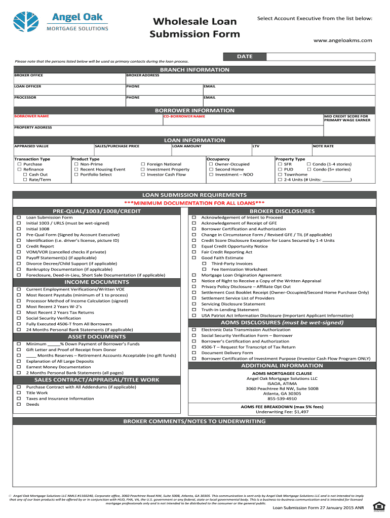Wholesale Loan Submission Form Select Account Executive from the list below: www.angeloakms.com DATE Please note that the persons listed below will be used as primary contacts during the loan process.
