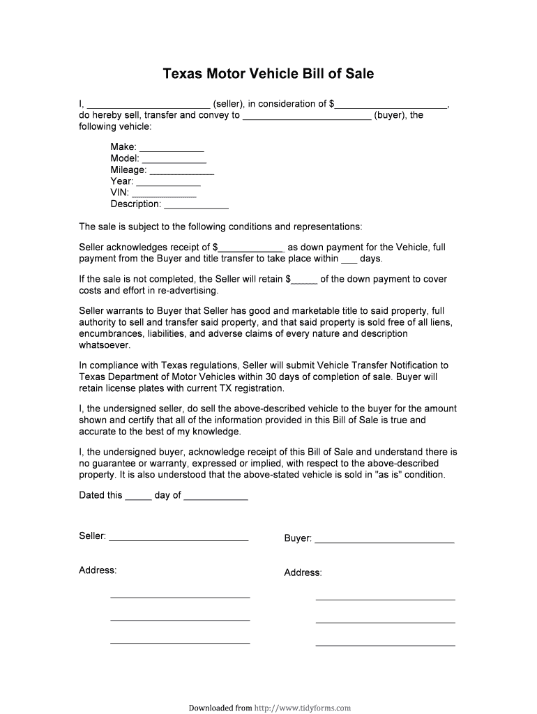 Texas Motor Vehicle Bill of Sale I, (seller), in consideration of $, do hereby sell, transfer and convey to (buyer), the following vehicle: Make: Model: Mileage: Year: VIN: Description: The sale is