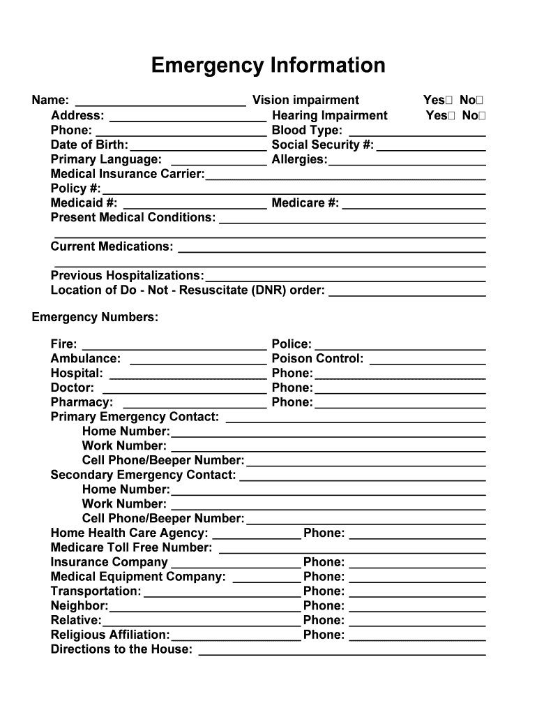 Emergency Information Name: Vision impairment Yes No Address: Hearing Impairment Yes No