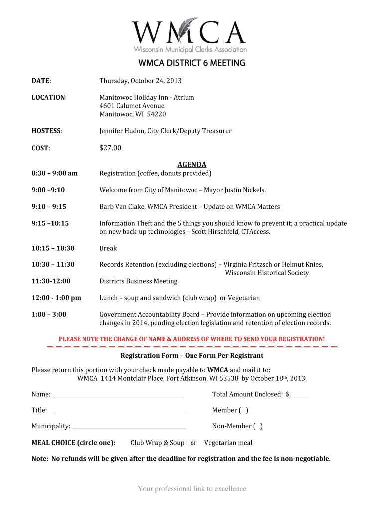 YMCA DISTRICT 6 MEETING DATE: LOCATION: HOSTESS: COST: 8:30 9:00 am 9:00 9:10 9:10 9:15 9:15 10:15 10:15 10:30 10:30 11:30 11:3012:00 12:00 1:00 pm 1:00 3:00 Thursday, October 24, 2013, Manitowoc