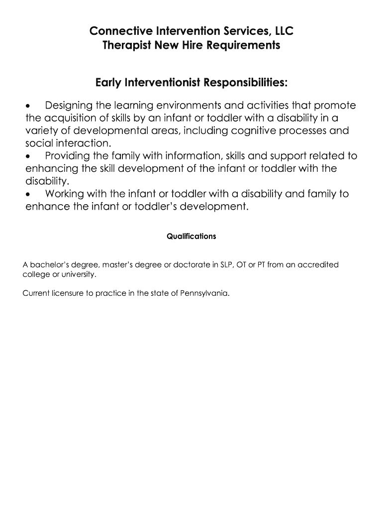 Connective Intervention Services, LLC Therapist New Hire Requirements Early Interventionist Responsibilities: Designing the learning environments and activities that promote the acquisition of skills
