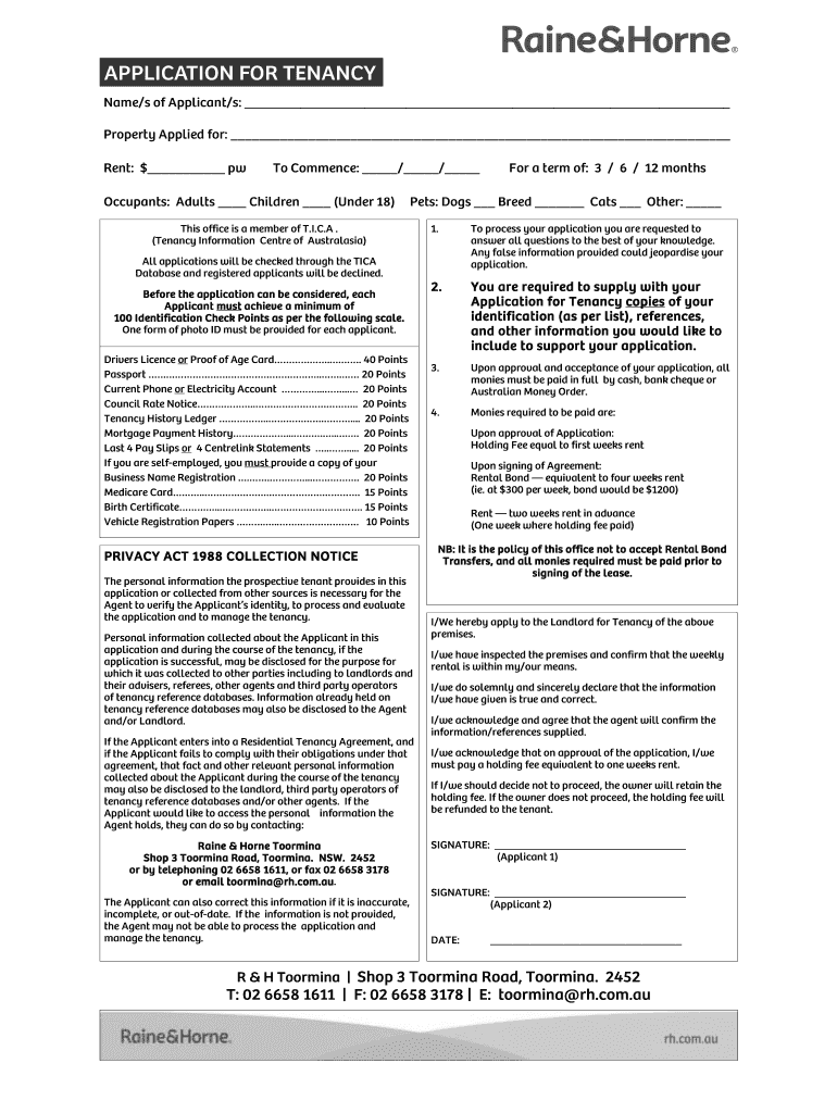 Get the free Application for Tenancy Toormy - braineandhornecomaub