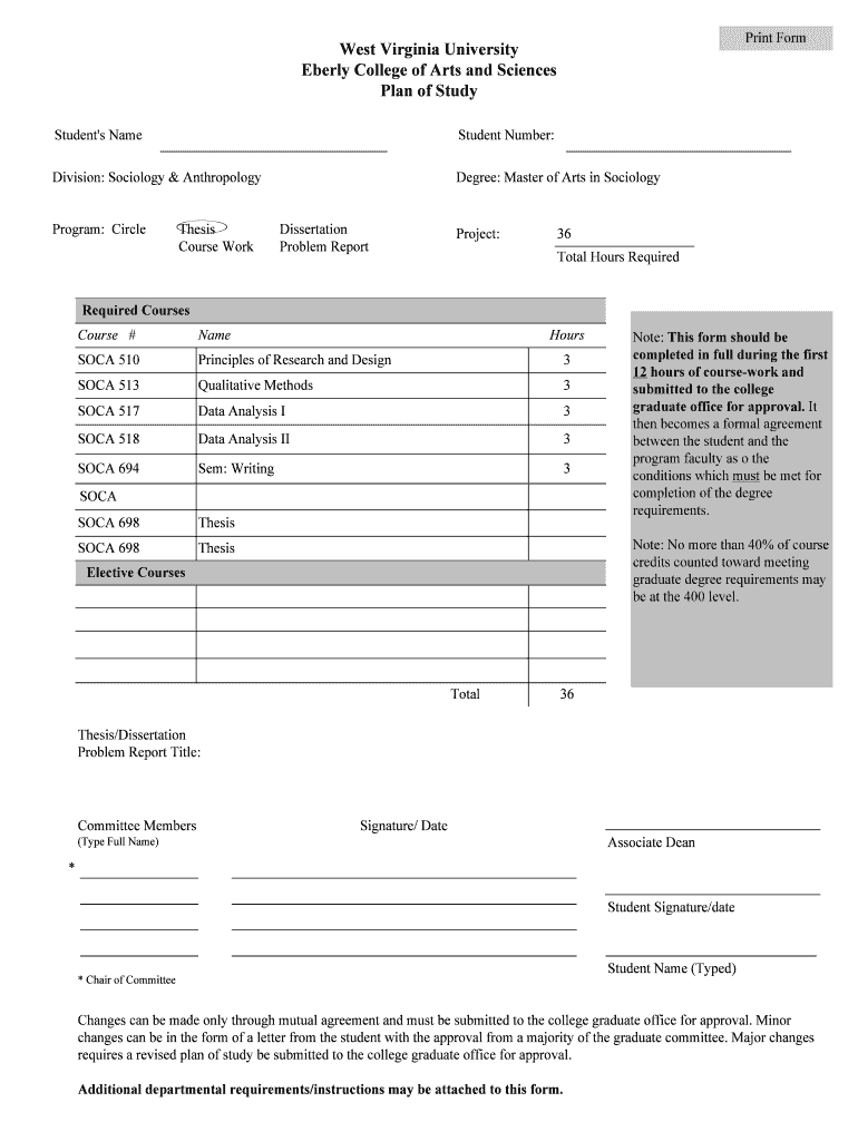 Print Form West Virginia University Eberle College of Arts and Sciences Plan of Study Student's Name Student Number: Division: Sociology & Anthropology Degree: Master of Arts in Sociology Program: