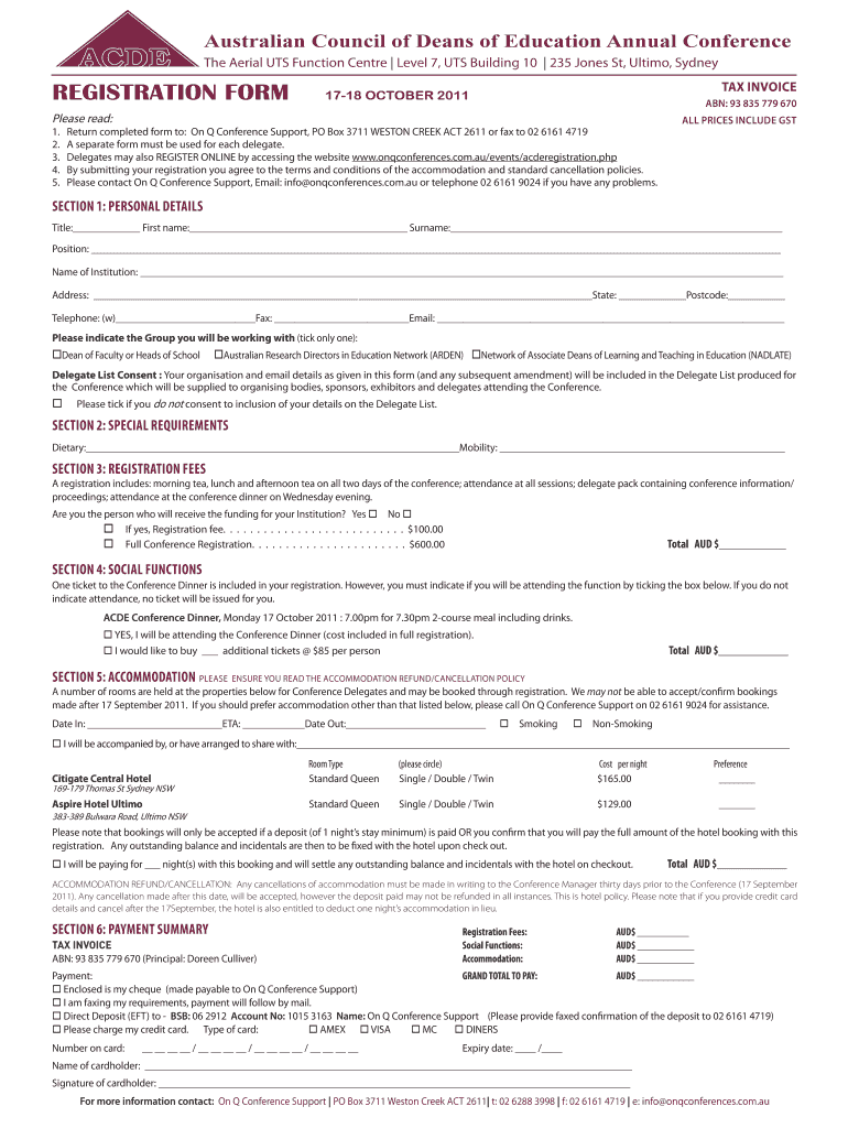 Australian Council of Deans of Education Annual Conference The Aerial ITS Function Center Level 7, ITS Building 10 235 Jones St, Ultimo, Sydney Registration Form TAX INVOICE 1718 October 2011 ABN: