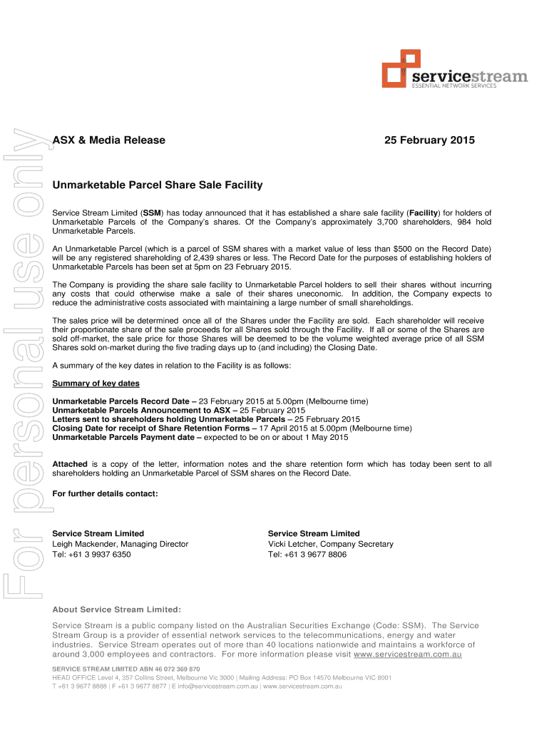 For personal use only ASX & Media Release 25 February 2015 Unmarketable Parcel Share Sale Facility Service Stream Limited (SSM) has today announced that it has established a share sale facility (Facility)