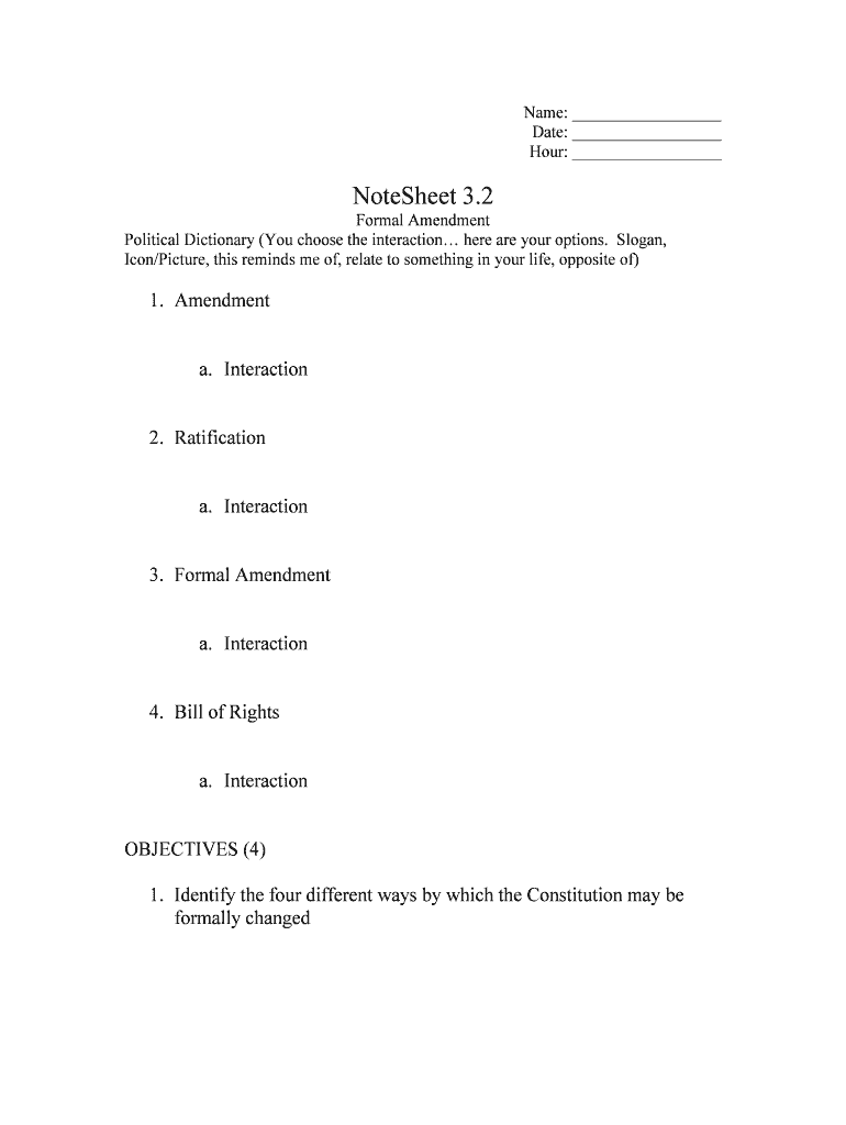 Name: Date: Hour: Worksheet 3.2 Formal Amendment Political Dictionary (You choose the interaction here are your options. Slogan, Icon/Picture, this reminds me of, relate to something in your life,