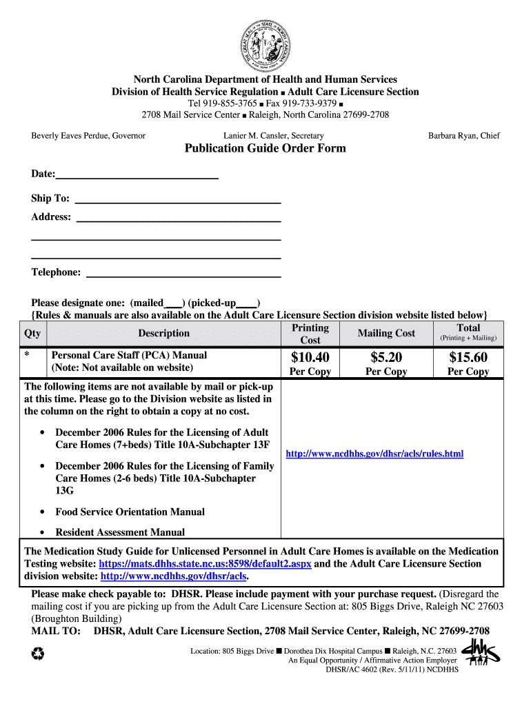 North Carolina Department of Health and Human Services Division of Health Service Regulation s Adult Care Licensure Section Tel 9198553765 s Fax 9197339379 s 2708 Mail Service Center s Raleigh, North