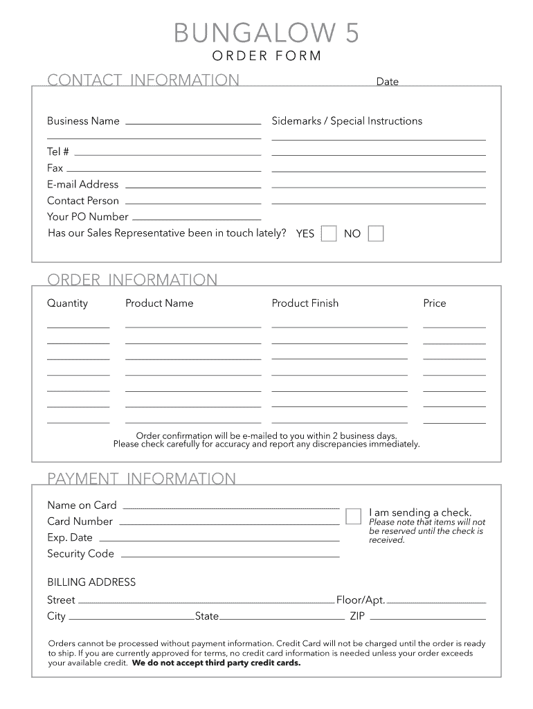 BUNGALOW 5 ORDER FORM CONTACT INFORMATION Business Name Date Tidemarks / Special Instructions Tel # Fax Email Address Contact Person Your PO Number Has our Sales Representative been in touch lately?