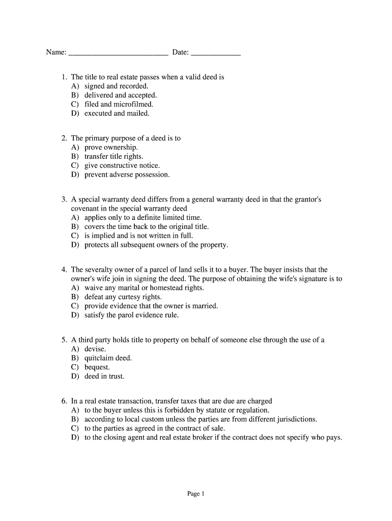 Name: Date: 1. The title to real estate passes when a valid deed is A) signed and recorded. B) delivered and accepted. C) filed and microfilmed. D) executed and mailed. 2. The primary purpose of a