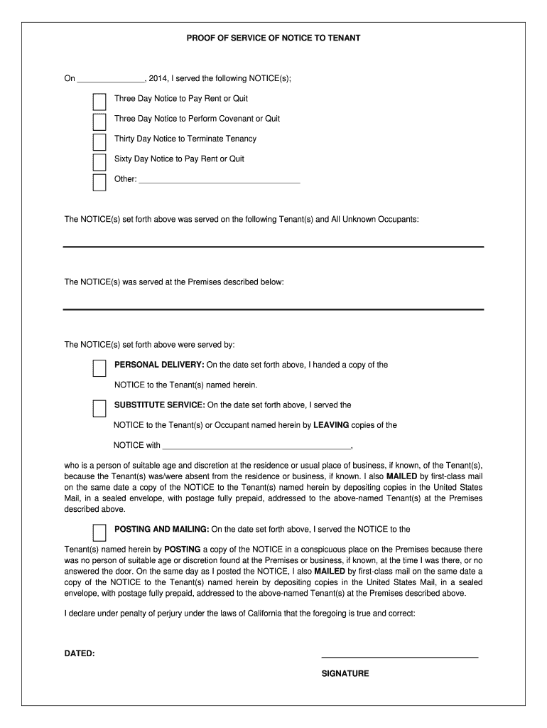PROOF OF SERVICE OF NOTICE TO TENANT On, 2014, I served the following NOTICE(s); Three Day Notice to Pay Rent or Quit Three Day Notice to Perform Covenant or Quit Thirty Day Notice to Terminate Tenancy