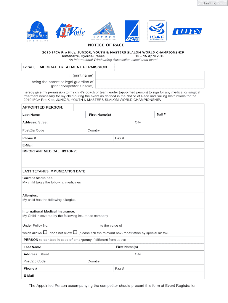 This form allows a parent or legal guardian to grant permission for medical treatment for their child during the 2010 IFCA Pro Kids, JUNIOR, YOUTH & MASTERS SLALOM WORLD CHAMPIONSHIP event.