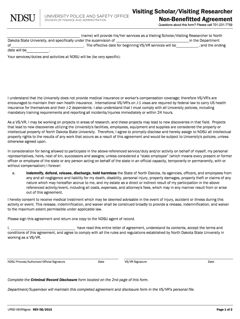 Visiting Scholar/Visiting Researcher Benefitted Agreement Questions about this form? Please call 7012317759 (name) will provide his/her services as a Visiting Scholar/Visiting Researcher to North