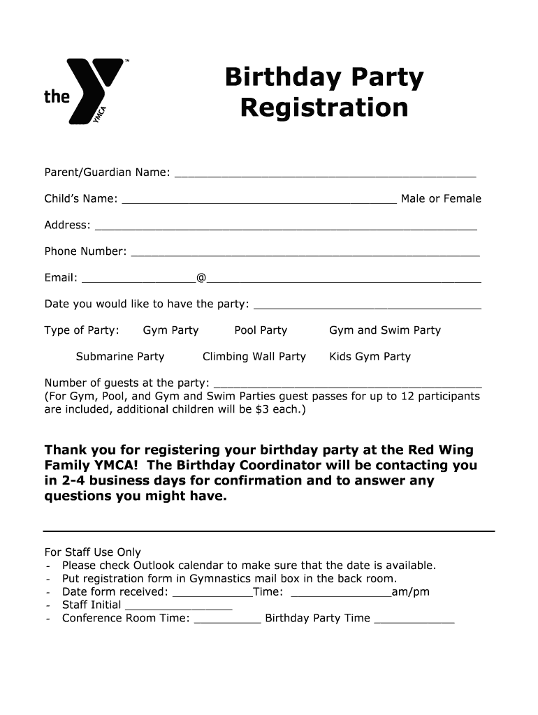 The birthday party registration parentguardian is a form that must be completed by a parent or guardian to register a child's birthday party.