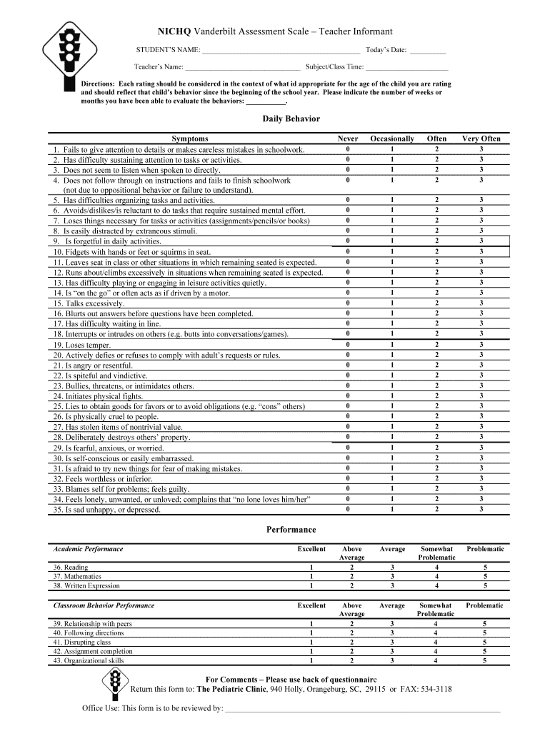 The nichq vanderbilt teachers copy can be filled out by answering the questions related to the child's behavior and submitting the completed form to the appropriate healthcare professional.