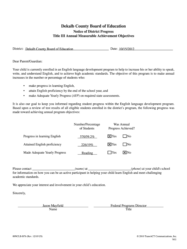 DeKalb County Board of Education Notice of District Progress Title III Annual Measurable Achievement Objectives District: Date: DeKalb County Board of Education 10/15/2012 Dear Parent/Guardian: Your